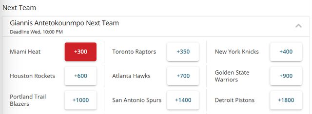 字母哥最新下家赔率:热火领跑